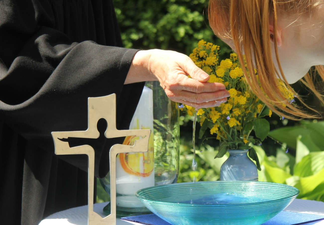 Kind mit Kopf über Taufschale im Freien